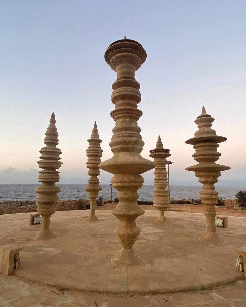 The Court for Concealed Thoughts consists of five stone pillars arranged in a circle overlooking the sea at Għar Lapsi, Siggiewi. Each pillar’s distinctive waveform shape was derived from audio recordings of villagers sharing personal secrets they wished to release. The work’s title draws on a linguistic connection in Maltese: mistur (concealed) and mistura (medicine) share the consonantal roots {M}–S–T–R, suggesting that what we hide and what heals us spring from a common source. Through the act of voicing what was once concealed, the work transforms secrecy into remedy.