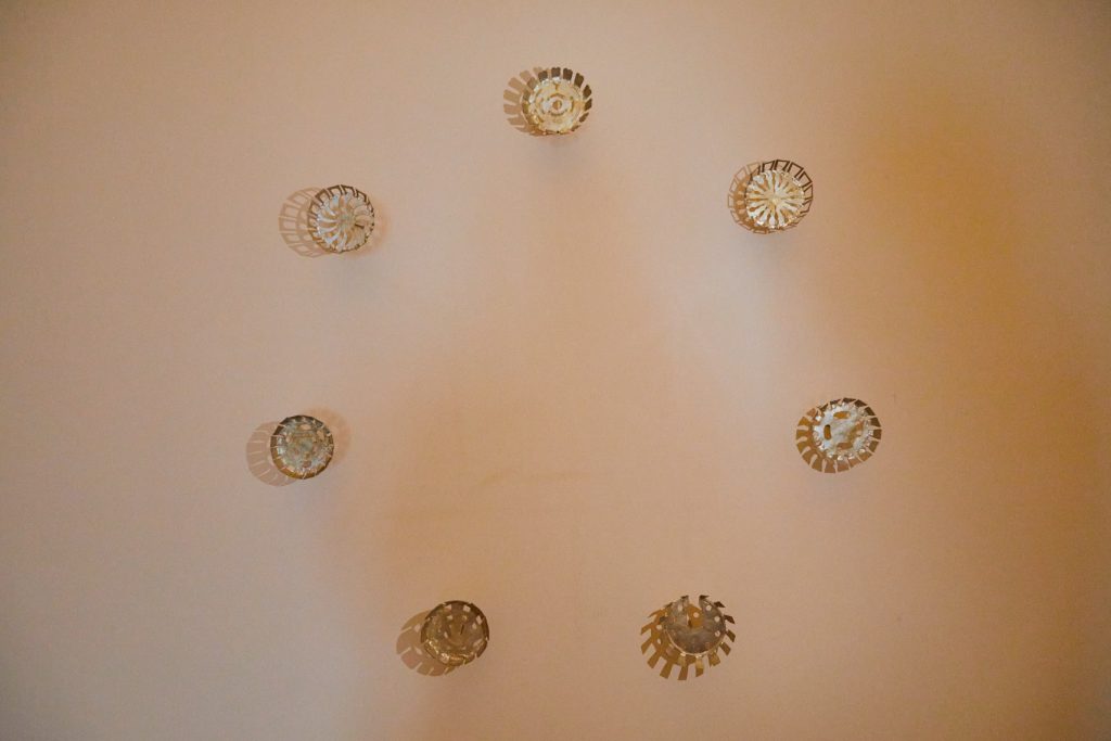 Aziza Shaden presents a site-specific hanging sculpture composed of white cotton collars produced in Uzbekistan. Its framing recalls the silhouette of a chandelier – an object long associated with aspiration in post-Soviet domestic interiors, especially working-class ones. Here, that symbol of elevation is quietly displaced, refracted through a theatre of the absurd. It becomes repetitive, excessive, slightly hollow. The work approaches cotton not simply as textile but as geopolitical residue, carrying the memory of an extractive modernity that reshaped land and bodies. In Central Asia, industrial cotton cultivation contributed to the Aral Sea’s slow exhaustion, turning a living ecosystem into an administrated landscape. Shaden’s gesture tentatively reassembles this trajectory: land becomes fibre, fibre garment, garment circulation, circulation surplus, surplus waste. Under exhibitionary conditions, waste becomes form.
